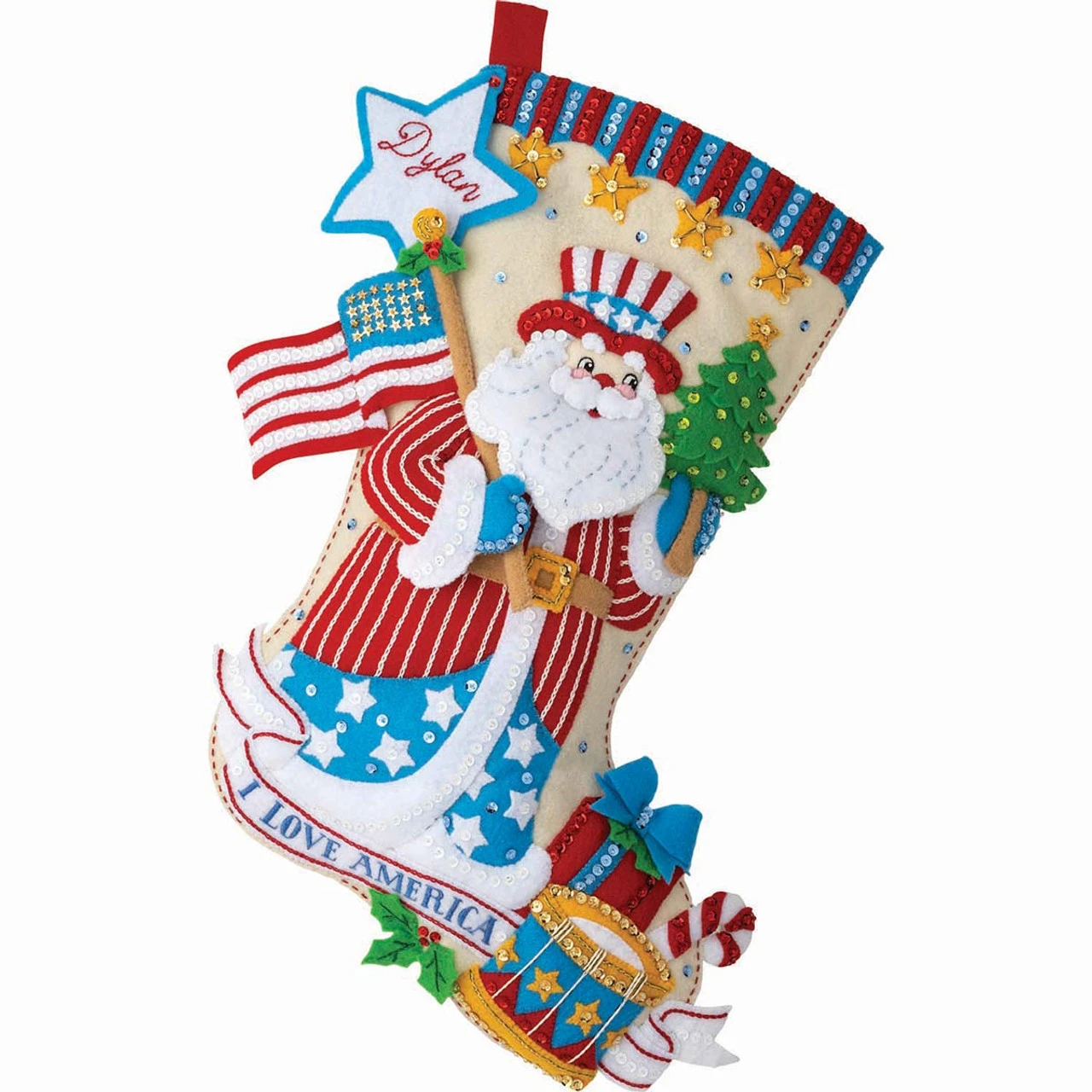 This Christmas stocking design features Santa Claus in a star-spangled suit ready to celebrate a patriotic Christmas! The Americana design shows St. Nick dressed in red and white striped coat with a star-spangled blue bottom and an Uncle Sam hat as he carries an American flag and small Christmas tree. A banner saying “I Love America” stretches across the bottom with a drum, wrapped present, and candy cane to complete the playful stocking design. The patriotic design includes a space to personalize the stocking with your name. This felt appliqué kit includes stamped felt, sequins, beads, cotton floss, needle, and instructions with directions for personalization. The cheerful design with iconic Christmas imagery makes a great gift for a new family member and a keepsake they’ll treasure year after year. Made in U.S.A.