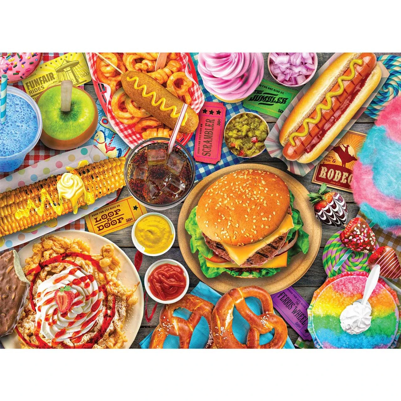 • The puzzle image features a table filled with a cheeseburger, hot dog, corn dog, curly fries, corn on the cob, funnel cake, pretzels, ketchup, mustard, cotton candy, chocolate-covered strawberries, a donut with sprinkles, a caramel apple, a slushy, ice cream, and other treats with carnival tickets and tickets for fun rides like the Ferris wheel and scrambler.