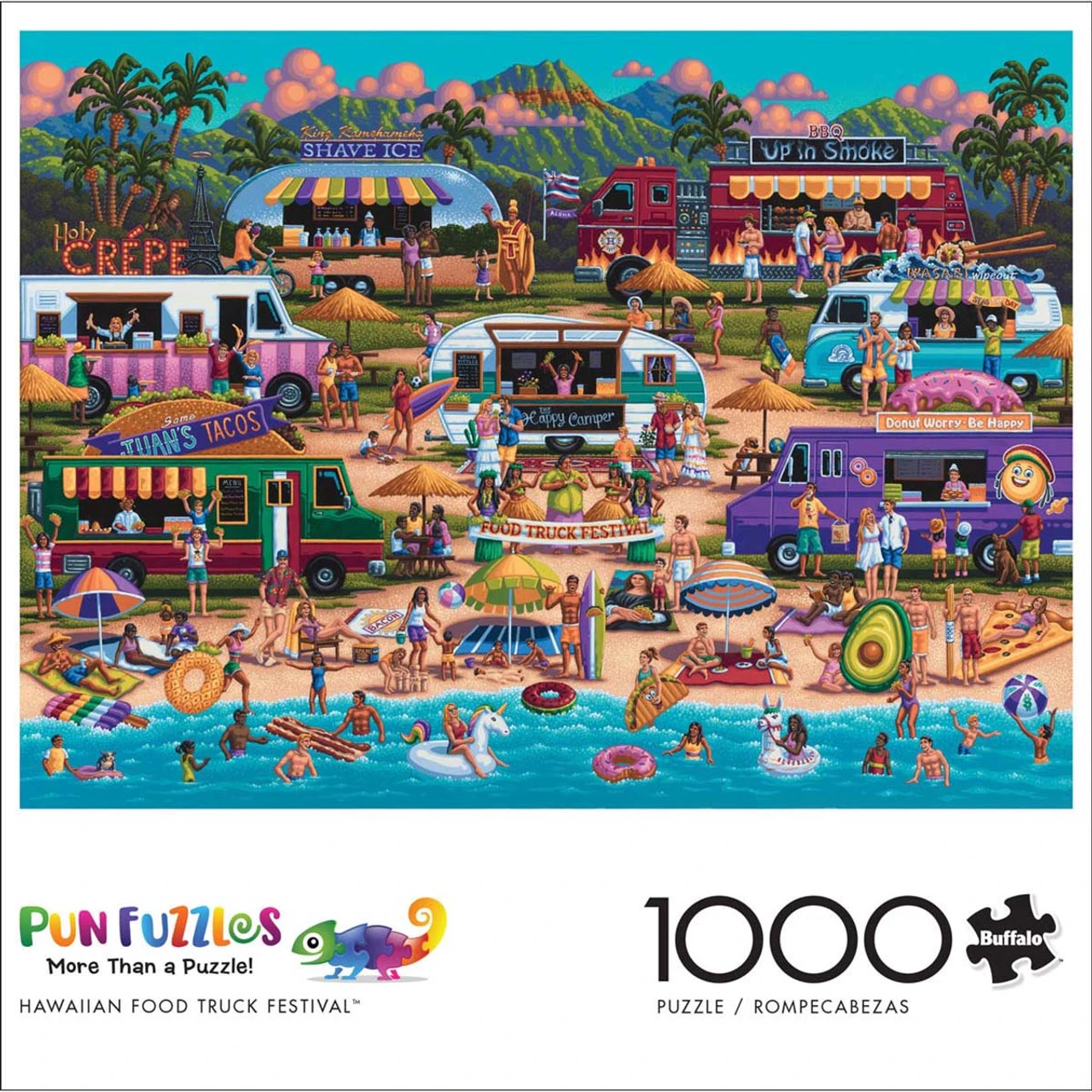 This 1,000-piece jigsaw puzzle features a fun day at the beach in Hawaii as a pod of food trucks serves up their tasty treats to the beachgoers. Playful business names advertise donuts, shaved ice, wasabi, tacos, crépes, and BBQ treats among others at this food truck festival. The food theme continues with the beach towels and pool floaties out on the water, from a giant avocado slice to colorful donuts, a taco, and a popsicle, as well as a boho llama and rainbow unicorn. This scene of summer fun in the sun is filled with so many details to discover! Precision-cut pieces allow for fast assembly and a quality finished image that can be framed as fun wall art (frame not included). 27 x 20″ (69 x 51cm).