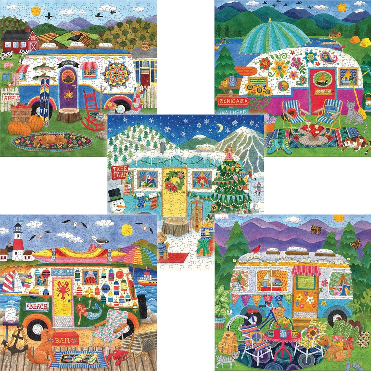 • The puzzle images feature a camper decorated with flowers, colorful flags, and lights with a table and two patio chairs on a rug next to a bicycle with a dog, cat, and potted plants; a camper parked at the beach covered in colorful stickers of fishing lures, mermaids, lobsters, and beach signs as it sits in the sand next to a bait box, lawn chair as a sailboat and tugboat come into the bay watched over by seagulls and a lighthouse; a camper parked at the lake, surrounded by a pair of lawn chairs and a small table on an area rug where two cats relax opposite a sign directing campers to the picnic area, trail head, snack bar, and more; a camper parked next to the fence of an apple orchard with a farmhouse, red barn, cows, and pigs in the background as well as farm fields and mountains in the distance; a camper decorated with stockings, garland, wreaths, Christmas lights, and a Christmas tree surrounded by presents and poinsettias with a snowman and dog welcoming people to the campsite at a Christmas tree farm.