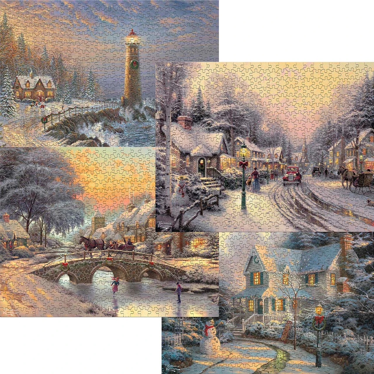 Spend the holidays in a winter wonderland created by beloved artist Thomas Kinkade in this multipack of jigsaw puzzles! This special pack includes four 500-piece jigsaw puzzle images featuring idyllic snowy landscapes. Scenes include villagers walking down busy streets to prepare for Christmas, horse-drawn sleigh rides over frozen rivers where young skaters glide along the, jolly snowmen greeting guests coming home for the holidays, and an icy coastal scene where a lighthouse stands tall above the rocky shore, decorated with a wreath. Each jigsaw puzzle measures 24 x 18″ (61 x 46cm).