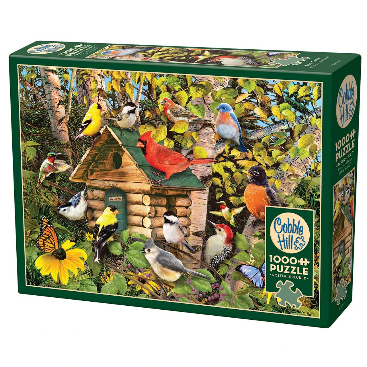 This 1,000-piece jigsaw puzzle features feathered friends having a party at a log cabin birdhouse! The lively woodland scene features a cardinal, robin, woodpecker, hummingbirds, chickadees, goldfinch, bluebird, and other favorite birds gathered around a birdhouse shaped like a log cabin. The house is surrounded by birch trees, and black eyed susans as butterflies flit around the woodland scene.
