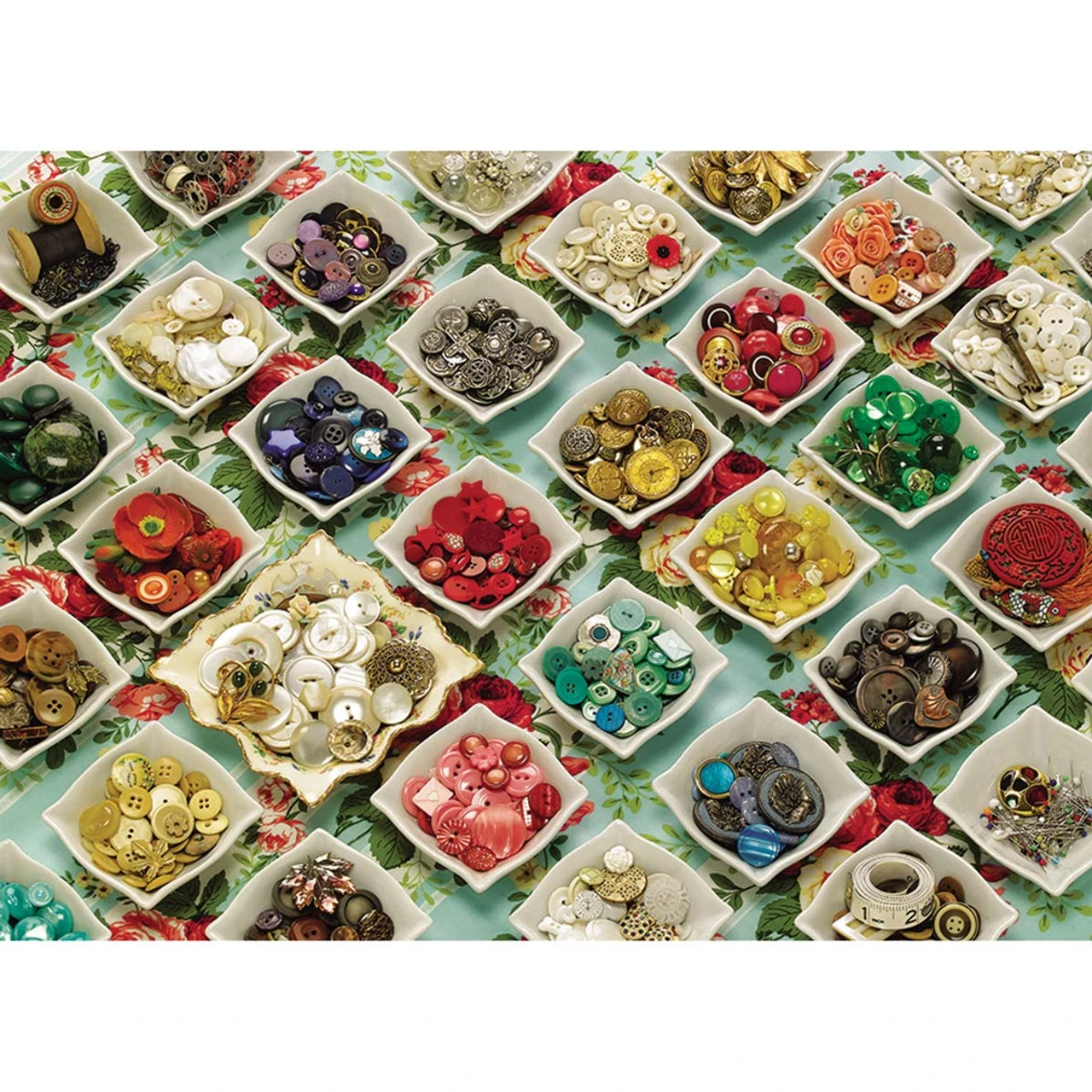 1,000 pieces. A rainbow of buttons makes a fun jigsaw puzzle collage and eye-catching wall art for your crafting space. 27 x 19″ (69 x 48cm).