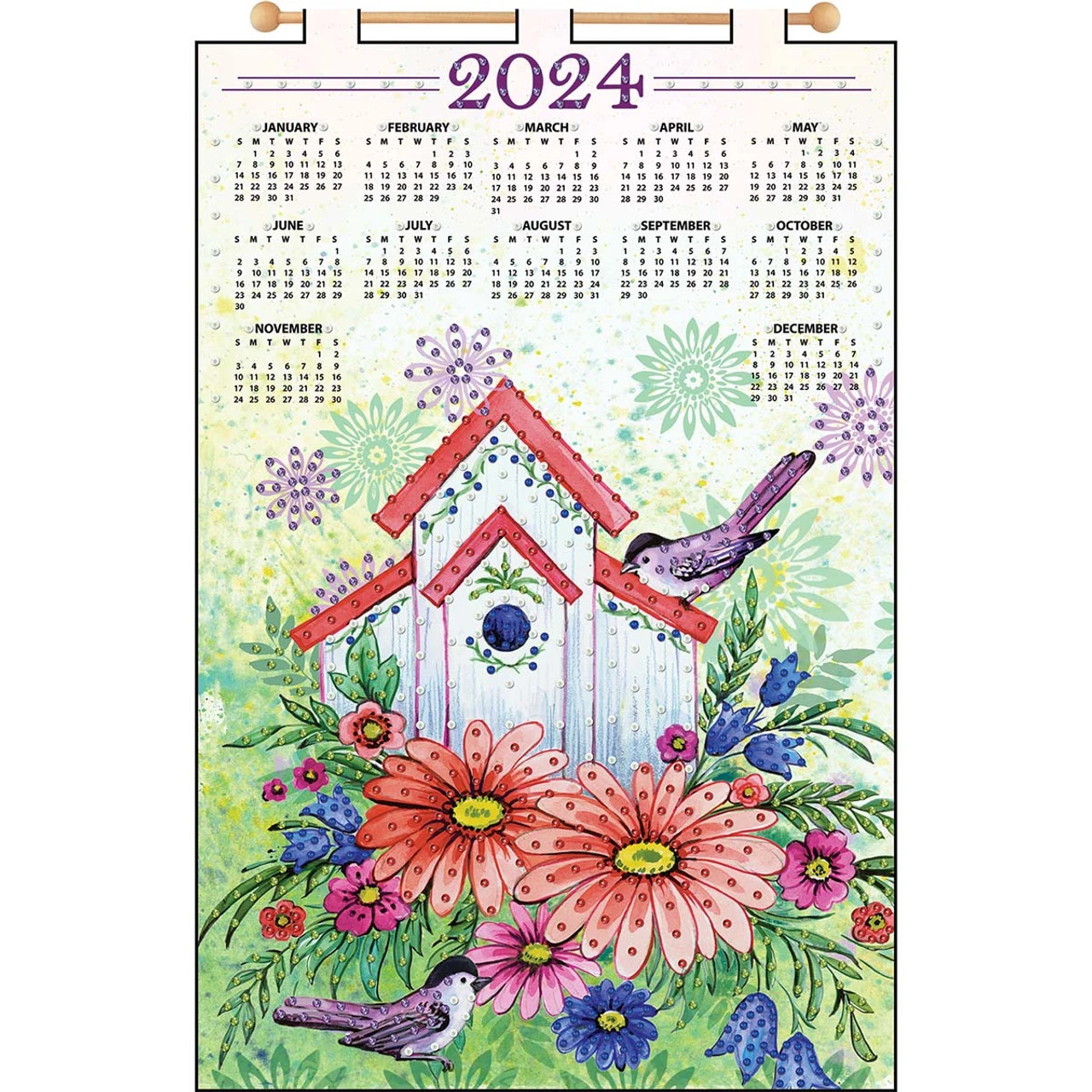 This quality felt calendar is printed with an image of a birdhouse painted with a red roof and vines, surrounded by brightly colored flowers and a pair of birds. A pattern of soft folk art flowers fades into the background behind an at-a-glance full calendar for 2024. The kit comes complete with everything needed to create and display your calendar: pre-printed designs on quality felt, color-separated sequins and beads, cotton floss, needles, and wooden dowels with finials for hanging. The calendar is accented with little dots indicating where to place the sequins, which can be sewn on with the included floss and needle or glued on if sewing isn’t your thing (glue not included). Finished calendar measures 16 x 24″ (41 x 61cm). Made in U.S.A.