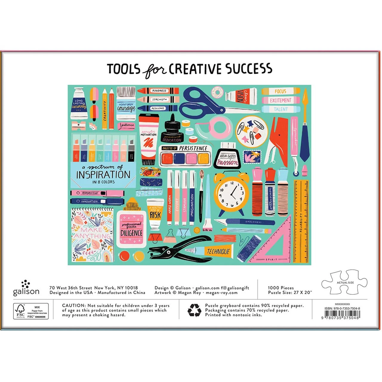 This 1,000-piece jigsaw puzzle features a celebration of creativity with a variety of tools and supplies you might find in your desk or crafting area. Arranged on a seafoam green background, this artistic collage includes scissors, tape, a hole punch, binder clips, rulers, a stapler, markers, crayons, glue, tape, paintbrushes, a clock, erasers, and various other tools and supplies for the creative spirit. Precision-cut pieces allow for fast assembly and a quality finished image that can be framed as fun wall art (frame not included). 27 x 20″ (69 x 51cm).