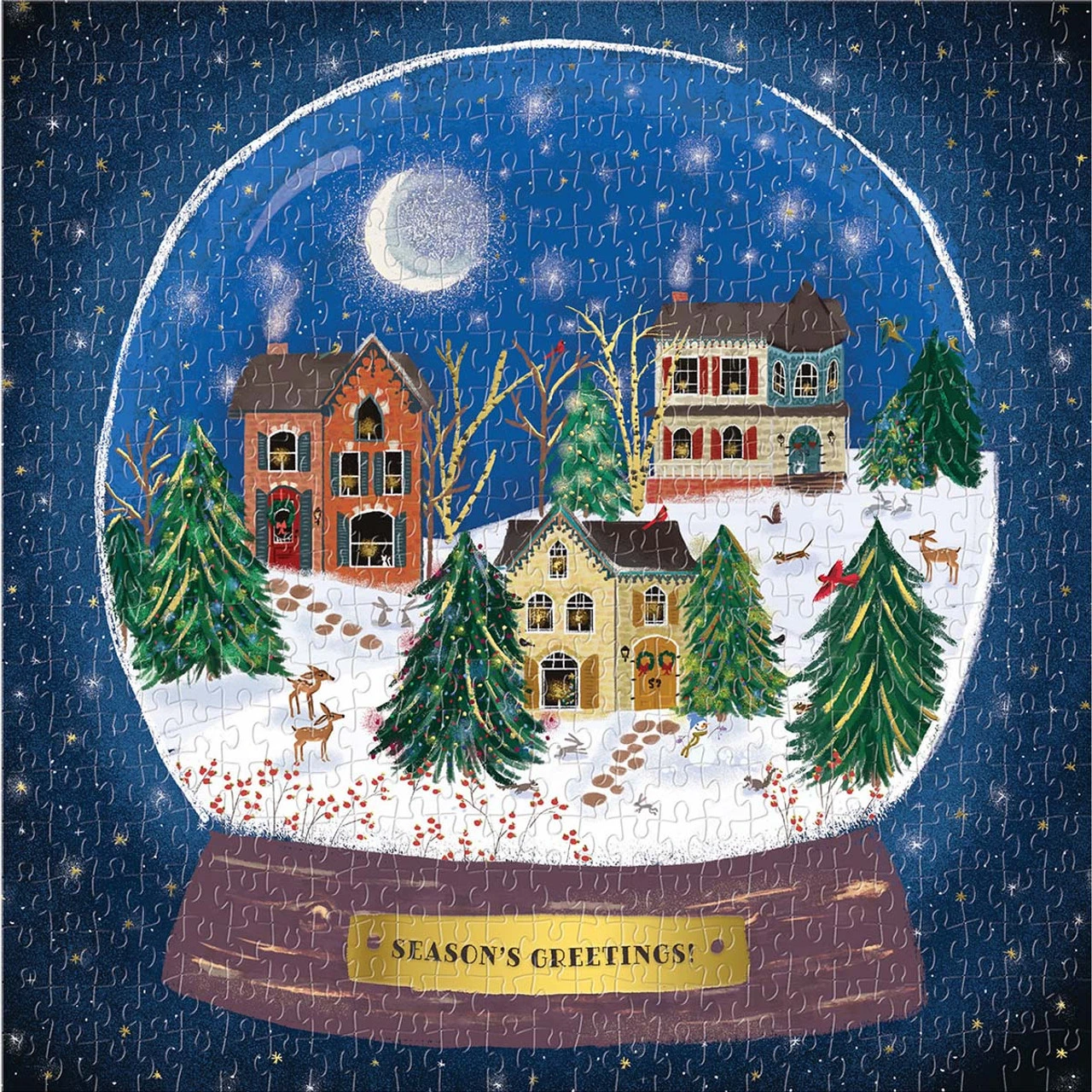 • The puzzle image features a snow globe containing three houses surrounded by evergreen trees and adeer walking around a snowy landscape under a crescent moon on a starry winter night with the words Season’s Greetings! on the base of the snow globe.