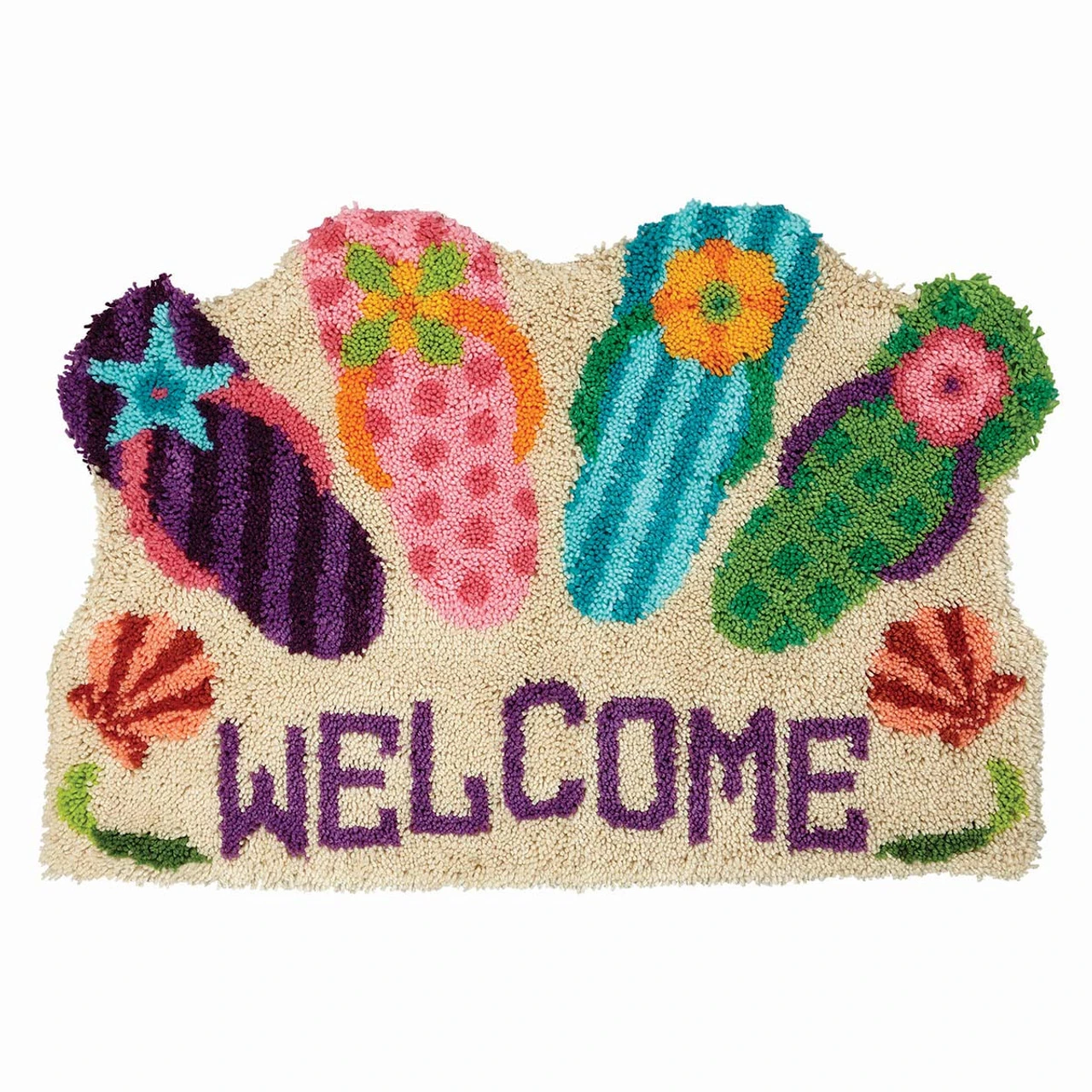 Welcome guests with a colorful beach-themed rug. Crafters of all ages and skill levels enjoy the variety latch hook provides. Finished projects can be made into pillows, wall hangings, rugs, and more. Kit includes 3.75-mesh gridded canvas, lofty pre-cut 100% acrylic yarn, clear vinyl storage bag, easy-to-follow chart, and instructions. Latch hook tool not included. The higher-gauge canvas of this project allows for a high level of detail in the finished design. 40 x 27″ (102 x 69cm). Imported.