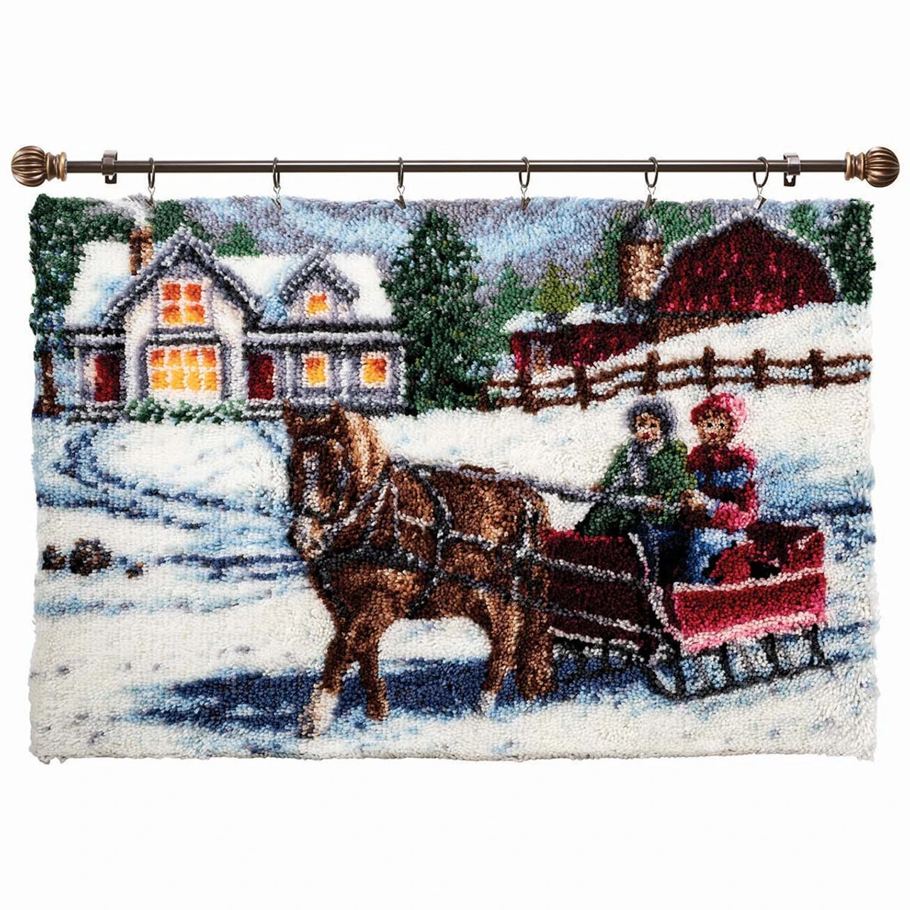 Christmas past is a sleigh ride away in this charming country scene. Crafters of all ages and skill levels enjoy the variety latch hook provides. Finished projects can be made into pillows, wall hangings, rugs, and more. Kit includes 3.75-mesh gridded canvas, lofty pre-cut 100% acrylic yarn, clear vinyl storage bag, easy-to-follow chart, and instructions. Latch hook tool not included. The higher-gauge canvas of this project allows for a high level of detail in the finished design. 40 x 27″ (102 x 69cm). Imported.