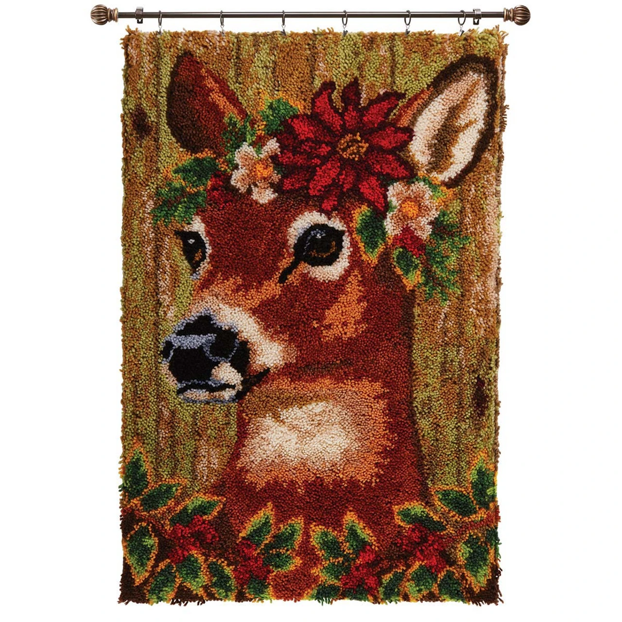 Dressed in a crown of seasonal blooms, this regal doe makes a statement in your holiday home. Crafters of all ages and skill levels enjoy the variety latch hook provides. Finished projects can be made into pillows, wall hangings, rugs, and more. Kit includes 3.75-mesh gridded canvas, lofty pre-cut 100% acrylic yarn, clear vinyl storage bag, easy-to-follow chart, and instructions. Latch hook tool not included. The higher-gauge canvas of this project allows for a high level of detail in the finished design. 27 x 40″ (69 x 102cm). Imported.
