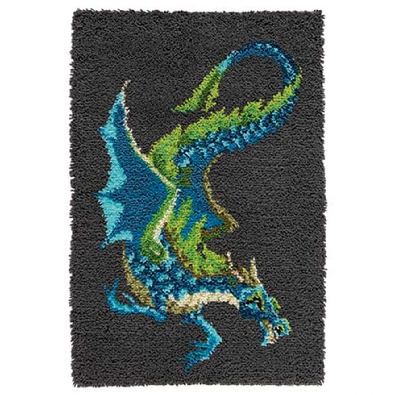 Add a bit of fantasy to your home with the tranquil hues of this striking water dragon. Crafters of all ages and skill levels enjoy the variety latch hook provides. Finished projects can be made into pillows, wall hangings, rugs, and more. Kit includes 3.75-mesh gridded canvas, lofty pre-cut 100% acrylic yarn, clear vinyl storage bag, easy-to-follow chart, and instructions. Latch hook tool not included. The higher-gauge canvas of this project allows for a high level of detail in the finished design. 27 x 40″ (69 x 102cm). Imported.