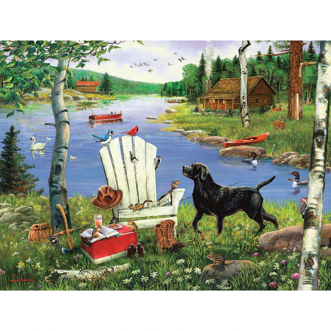 • The puzzle image features a black lab investigating the songbirds perched on the white Adirondack chair on the edge of a mountain lake surrounded by birch trees, deer, swans, loons, and log cabins.