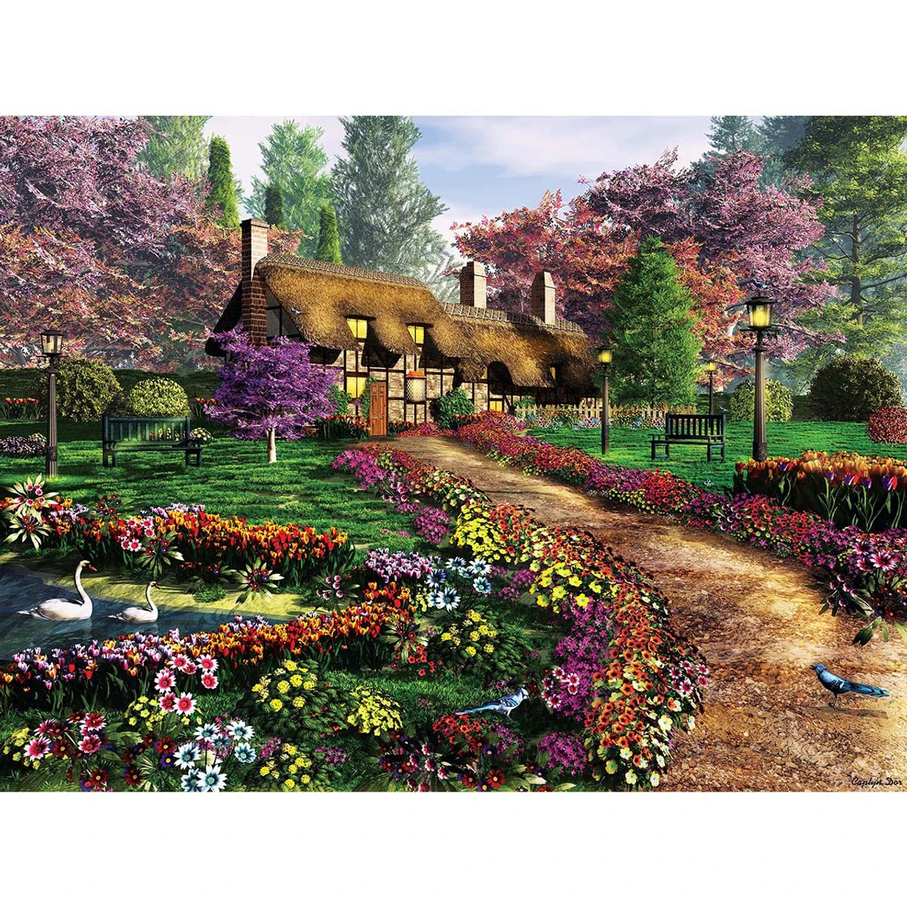1,000 pieces. An inviting cottage surrounded by beautiful flower gardens offers a relaxing escape and hours of puzzling fun. 27 x 20″ (69 x 51cm).