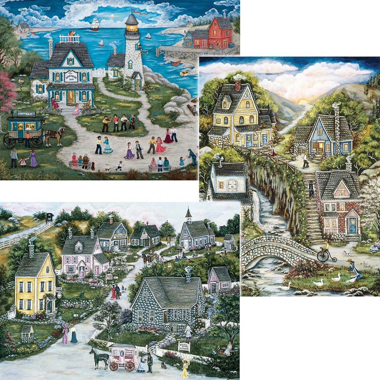 Explore the hustle and bustle of these jigsaw puzzle villages. Set of three includes one 300-piece and one 550-piece, both 24 x 18″ (61 x 46cm) puzzles, and one 1,000-piece, 27 x 20″ (69 x 51cm) puzzle.