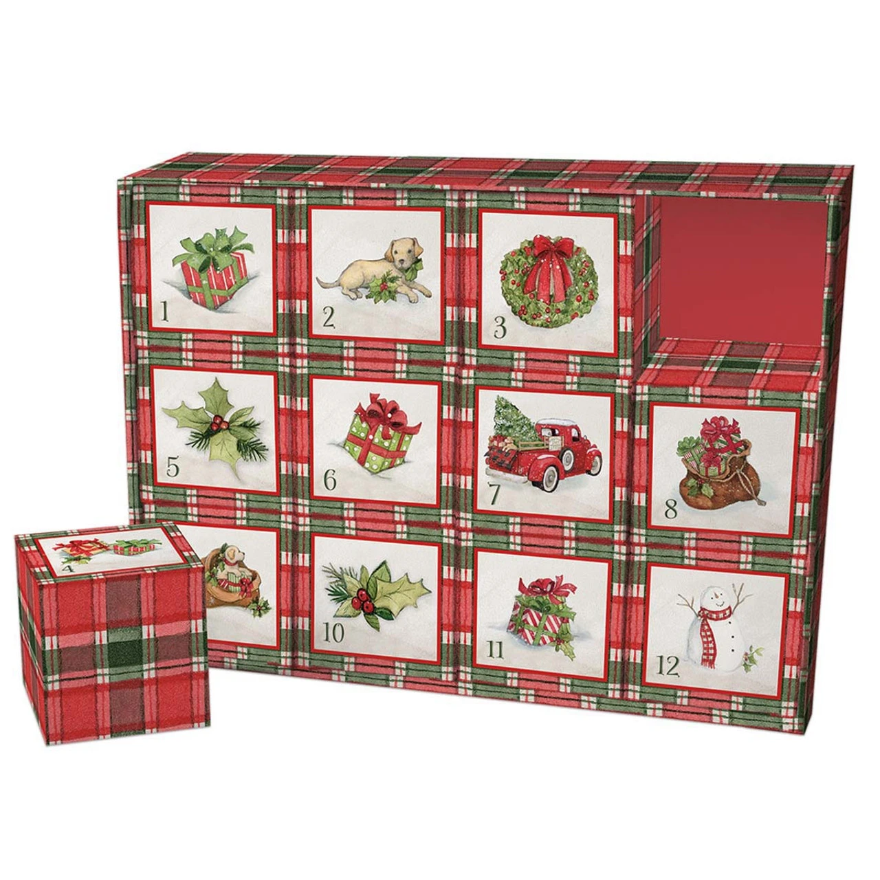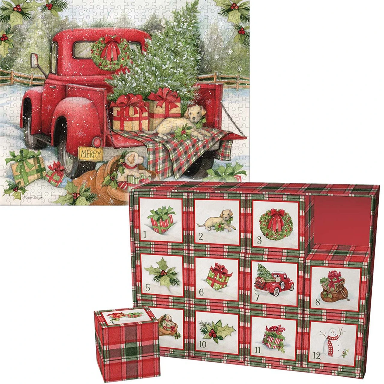 Create a 500-piece jigsaw puzzle one day at a time with this advent calendar collection of 12 mini jigsaw puzzles that connect into one large Christmas scene! This classic Christmas scene features a vintage red truck on a snowy day, its bed filled with a Christmas tree, presents, and two little puppies ready to make the holiday season joyful for a good little boy or girl. The advent calendar-inspired jigsaw puzzle makes a great family project as you count down to Christmas day by assembling each miniature puzzle.
