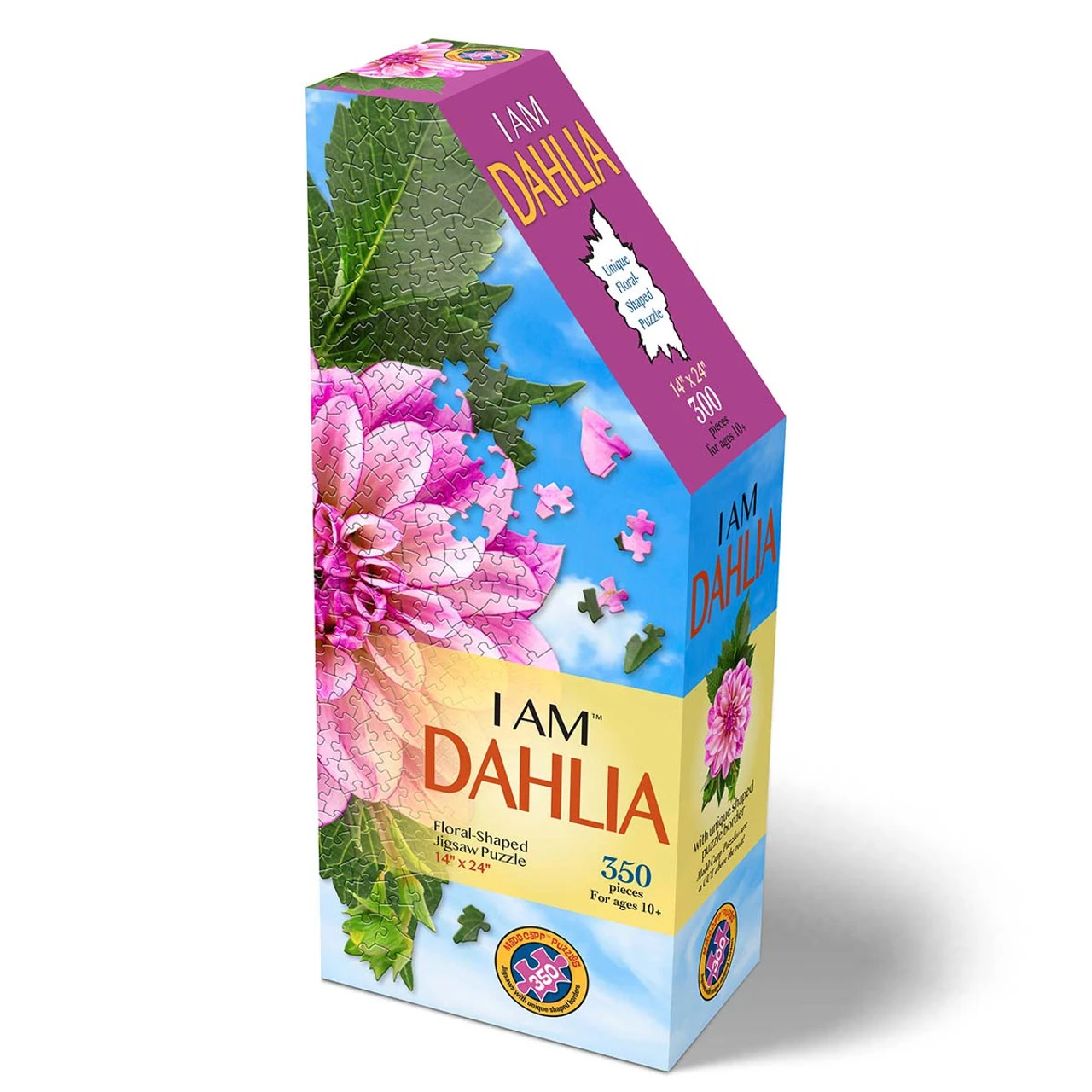 This 350-piece jigsaw puzzle features a bright pink dahlia flower surrounded by green leaves. This floral-shaped jigsaw puzzle has puzzle pieces with uniquely shaped borders, adding an extra challenge to your puzzling experience. Designed for ages 10+, this jigsaw puzzle makes a fun family project, and includes a bonus booklet with fun facts about dahlias, as well as a guide to growing dahlias in your garden. The finished puzzle measures 14 x 24″ (36 x 61cm).