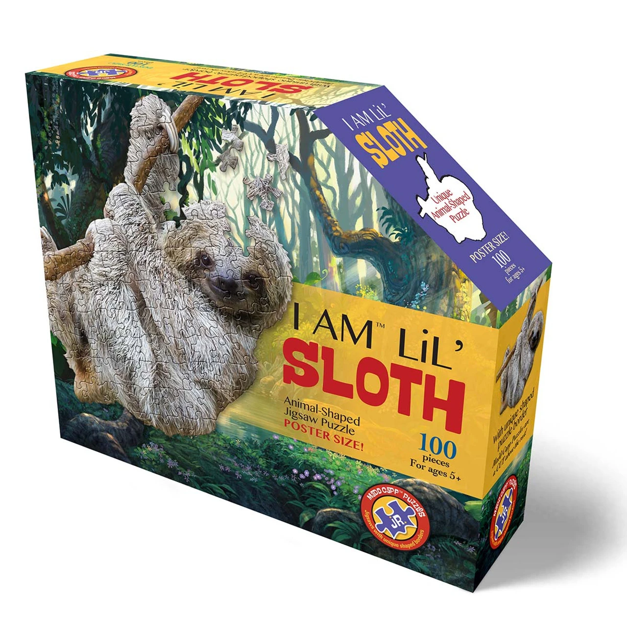 This 100-piece jigsaw puzzle features a sloth smiling as it hangs from the bottom of a branch. This shaped jigsaw puzzle has puzzle pieces with uniquely shaped borders, adding an extra challenge to your puzzling experience. Designed for ages 5+, this jigsaw puzzle makes a fun family project, and includes a bonus booklet with fun facts about sloths. The finished puzzle measures 30 x 28″ (76 x 71cm).
