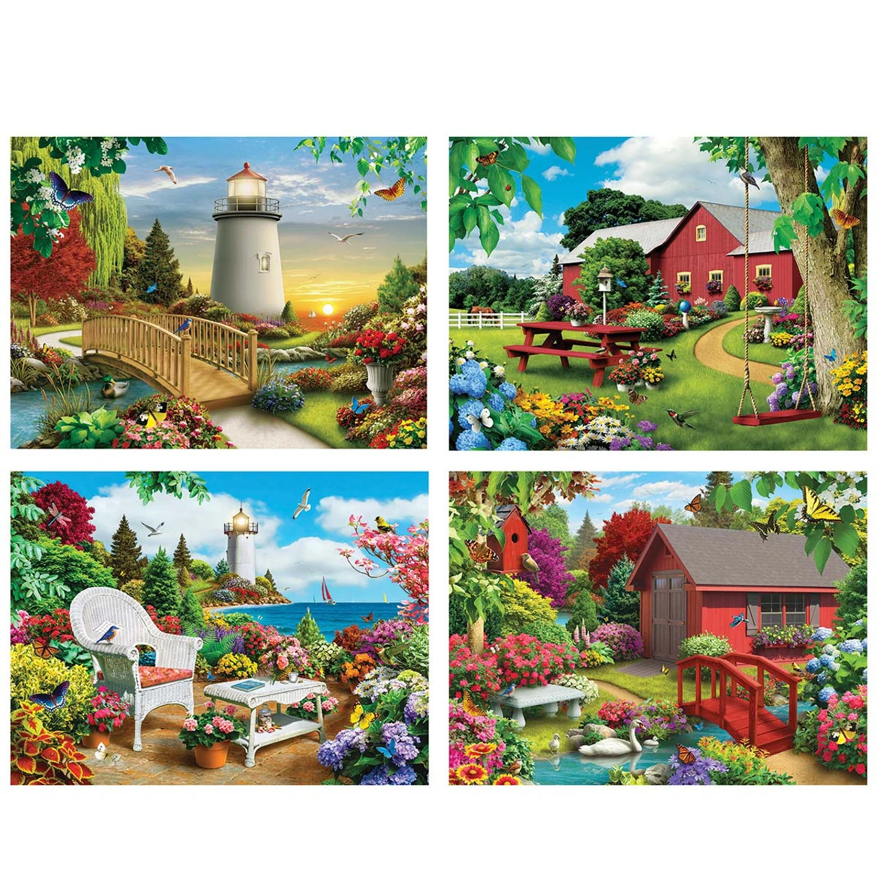 • The puzzle images feature a country farm with barn scene, flower garden with footbridge, coastal lighthouses, and relaxing wicker chairs in beautiful seaside flower gardens.
