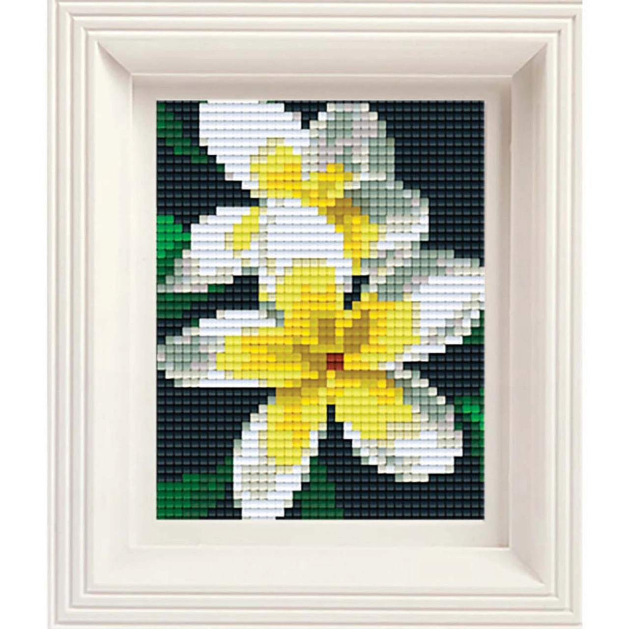This mini mosaic features a close-up view of white frangipani blooms with bright yellow and white petals. The small size of the design makes this mini mosaic a great beginning project! Kit includes base plate, colored pixel squares (tiles), plastic frame, and instructions. Tweezers not included. Follow the instructions to arrange the tiles on the base plate and watch the image form piece by piece. Mosaic measures 4 x 5″ (10.2 x 12.7cm).