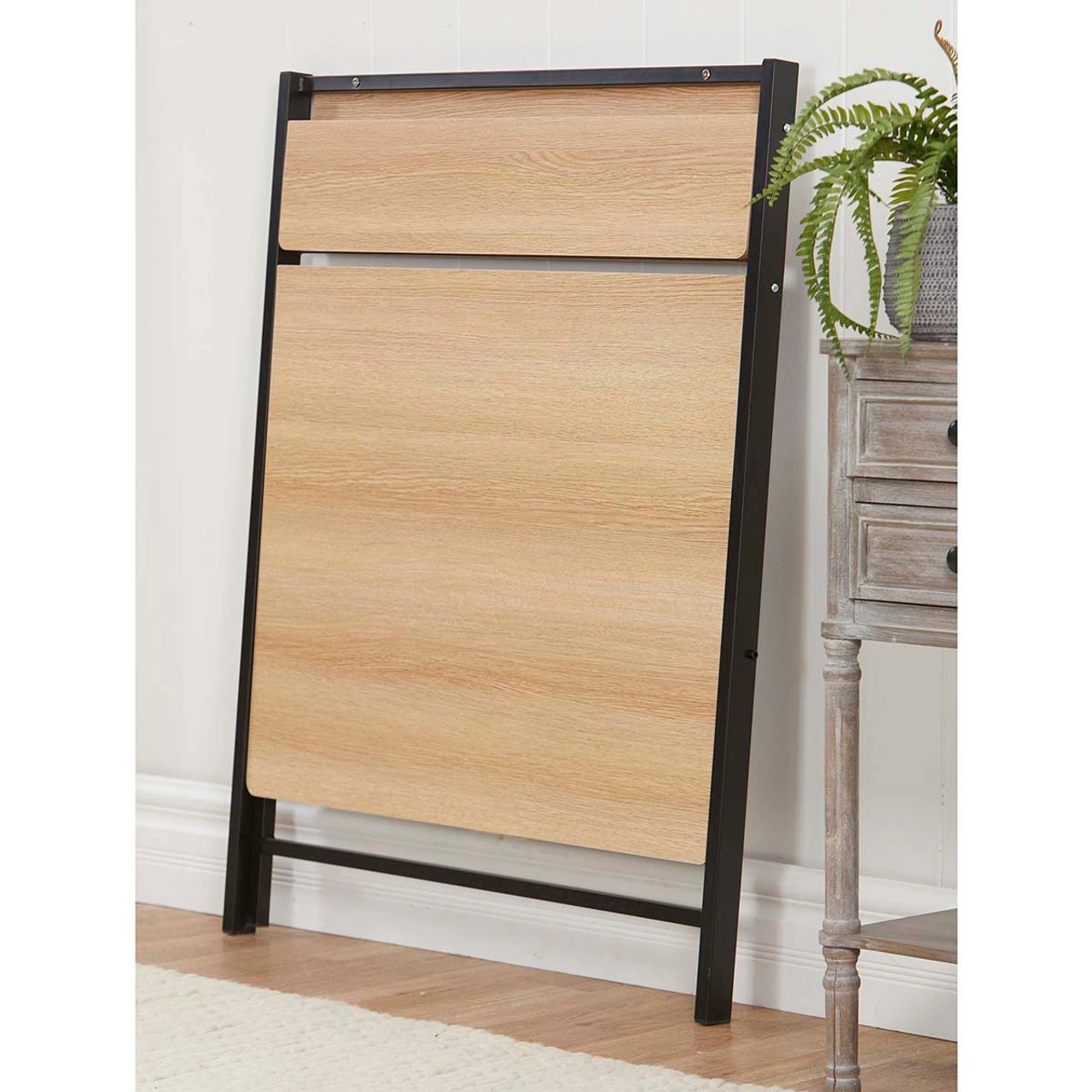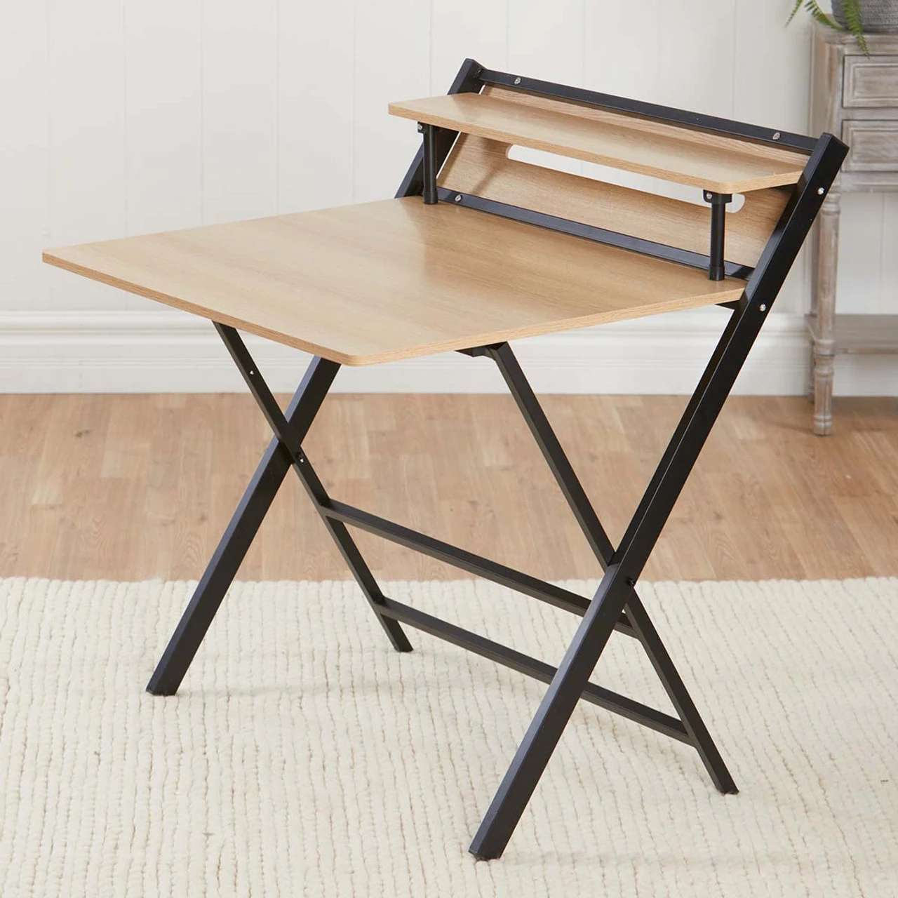 • Hobby table features metal legs and a wooden top. Comes with a raised shelf to hold a lamp or as a place to set tools and supplies.