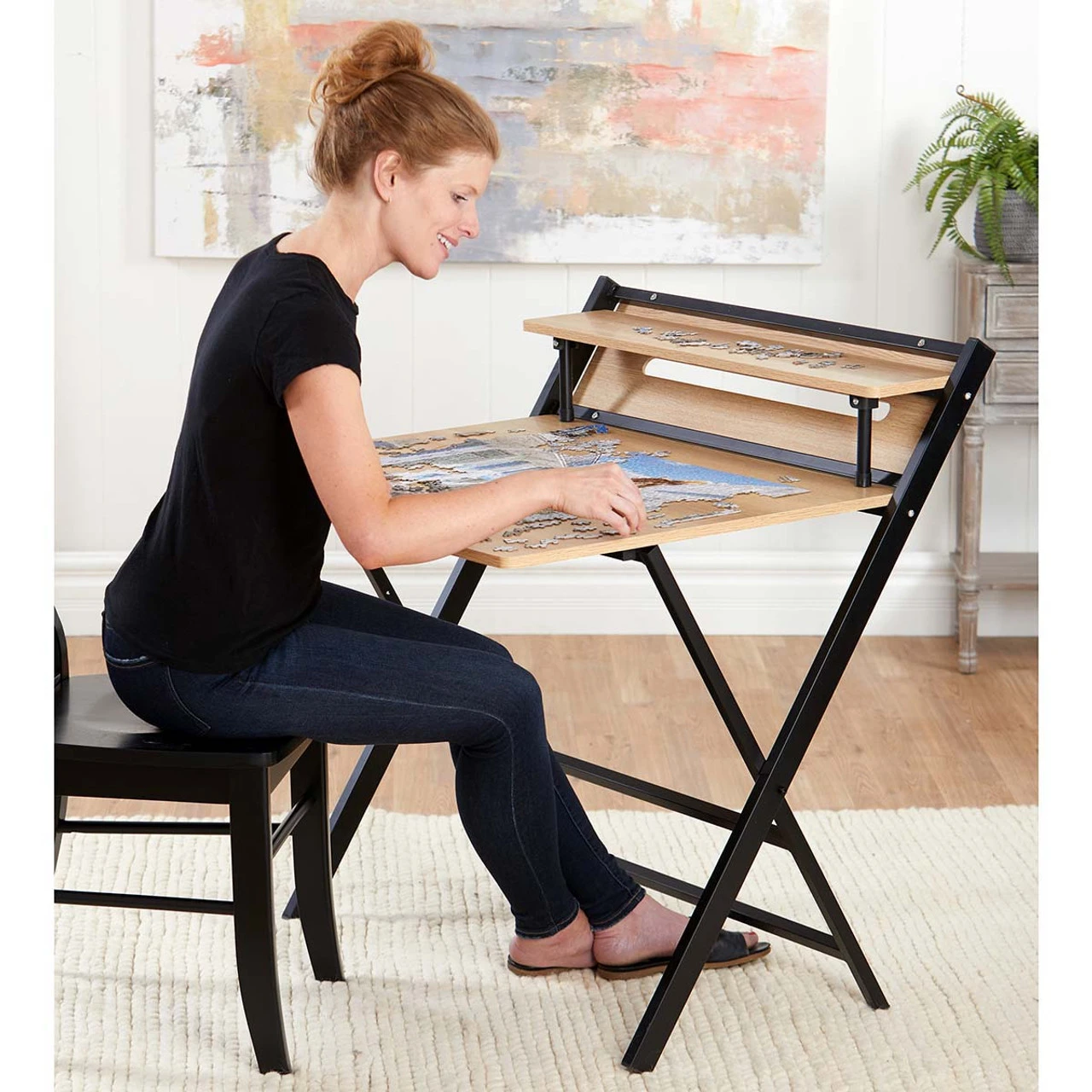 Available only at Herrschners! Expand your workspace with this folding hobby table. Designed with convenience in mind, this durable hobby table offers a 20 x 32″ (51 x 78cm) work surface perfect for jigsaw puzzles, diamond painting, model making, and more. The raised shelf offers space to hold a small lamp for extra light, or to hold tools, notions, and crafting supplies while you work. The sturdy metal legs offer a stable base as you work. When you’re done working, the hobby table folds flat for easy storage between projects.