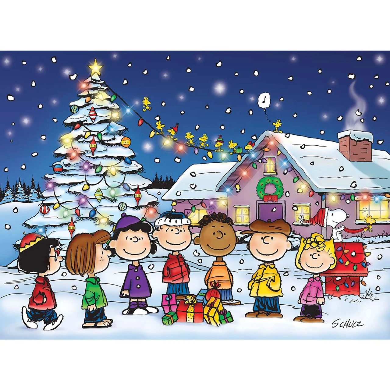 • The puzzle image features Charlie Brown, Sally, Peppermint Patty, Lucy, Marcie, Franklin, and Linus gathered around a pile of presents on a snowy winter night as Snoopy and Woodstock decorate the doghouse and a brightly lit house and Christmas tree serve as a backdrop to holiday scene.