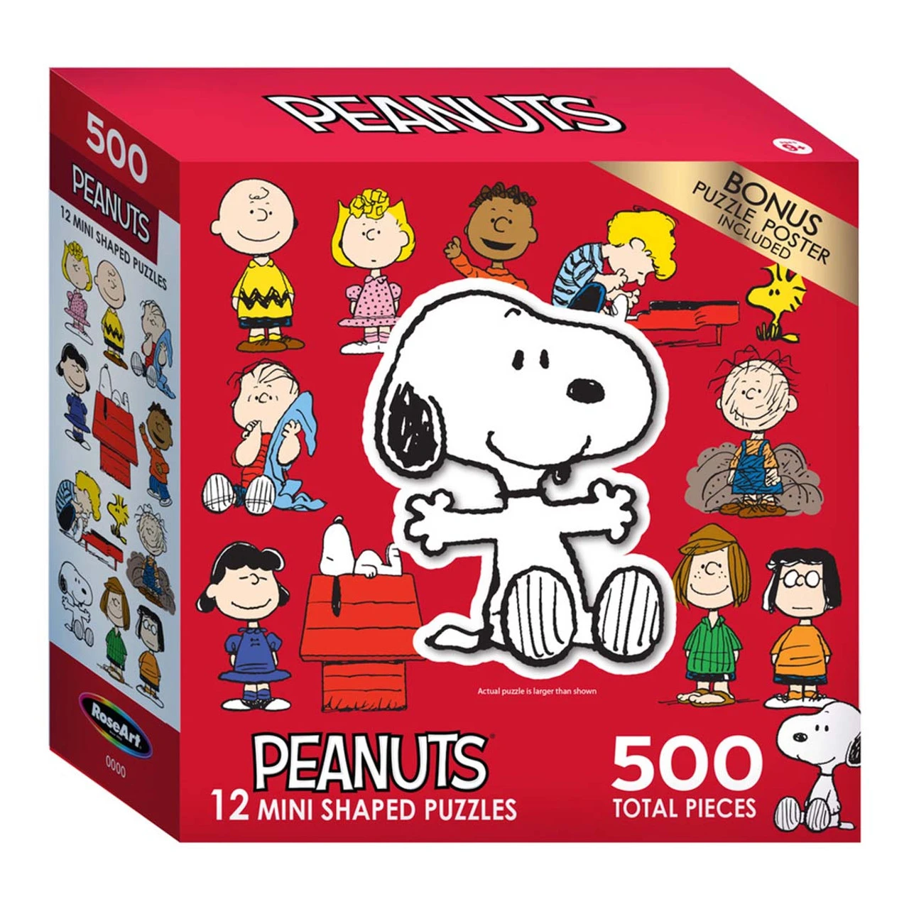 • The puzzle image features beloved Peanuts characters of Charlie Brown, Sally, Linus, Lucy, Snoopy, Peppermint Patty, Woodstock, Pigpen, Franklin, Schroeder, and Marcie.