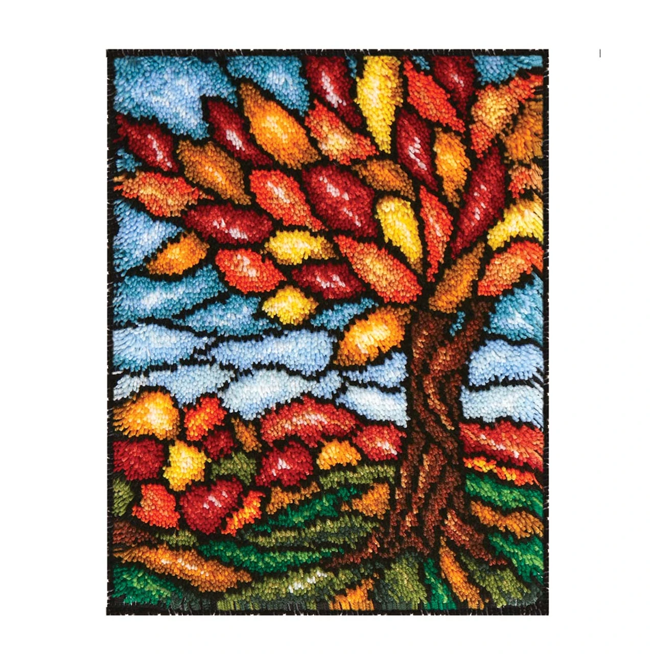 This autumn latch hook design features a fall landscape in the style of a stained glass window. The fiery colors of the tree’s leaves and the distant landscape make this autumn design perfect for seasonal decorating. The finished project can be made into pillows, wall hangings, rugs, and more. Kit includes 3.75-mesh gridded canvas, lofty pre-cut 100% acrylic yarn, easy-to-follow chart, and instructions. Latch hook tool not included, rug binding, and non-slip backing not included. The higher-gauge canvas of this project allows for a high level of detail in the finished design. 20 x 27″ (51 x 69cm). Imported.