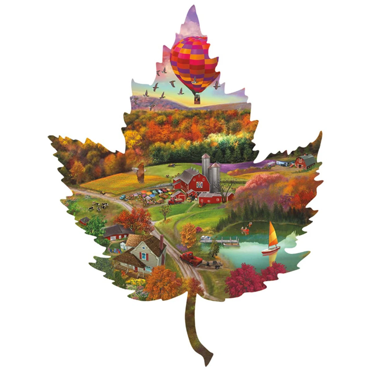 This 1,000-piece jigsaw puzzle features a colorful hot air balloon sailing over an idyllic country landscape with a big red barn, a farmhouse, and a nearby lake with sailboats enjoying an autumn afternoon on the water. The jigsaw puzzle is created in the shape of a maple leaf, enhancing the fall vibes of this beautiful scene filled with the rich colors of the harvest season. Precision-cut pieces allow for fast assembly and a quality finished image that can be framed as fun wall art (frame not included). This puzzle comes with a bonus poster to reference as you work or hang on your wall! 27 x 36″ (69 x 91cm).
