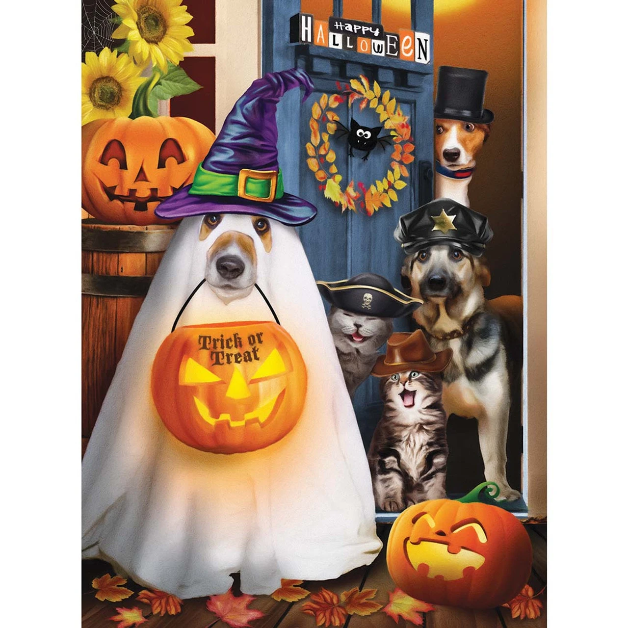 • The puzzle image features a dog dressed as a ghost wearing a witch’s hat holding a jack-o’-lantern bucket that reads trick or treat standing outside a doorway filled with cats dressed as a pirate and cowboy and dogs dressed in a policeman’s hat and a top hat surrounded by Halloween decorations and autumn foliage.