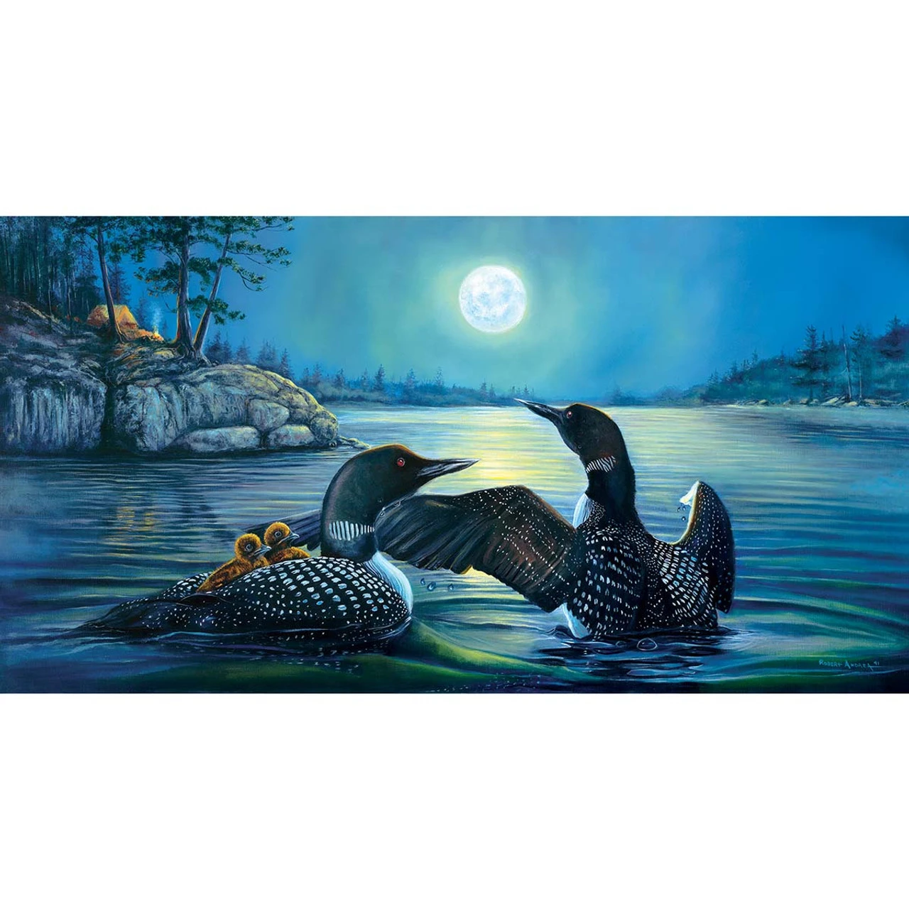 • The puzzle image features loons and their babies swimming on a lake on a full moon light with a tent pitched on the rocky cliff of this woodland setting.