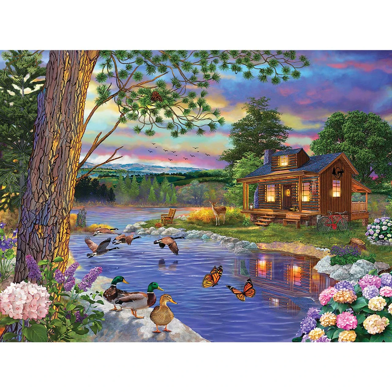 • The puzzle image features a log cabin by a river with deer, geese, ducks, butterflies, and flowers in a woodland setting at sunset.