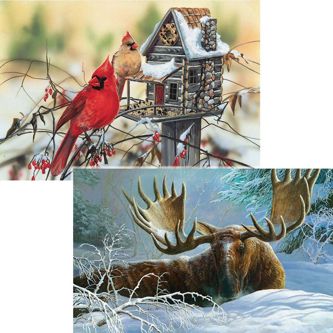 • The puzzle images feature two cardinals perched on berry-covered branches by a birdfeeder designed to look like a log cabin with a stone chimney and a moose laying down in the snow surrounded by snow-covered branches and trees.