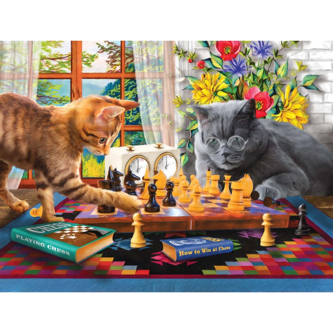 • The puzzle image features an orange striped cat and a gray cat in glasses playing chess on a table by the window surrounded by books on how to play chess, a quilted table topper, and a colorful bouquet of flowers.