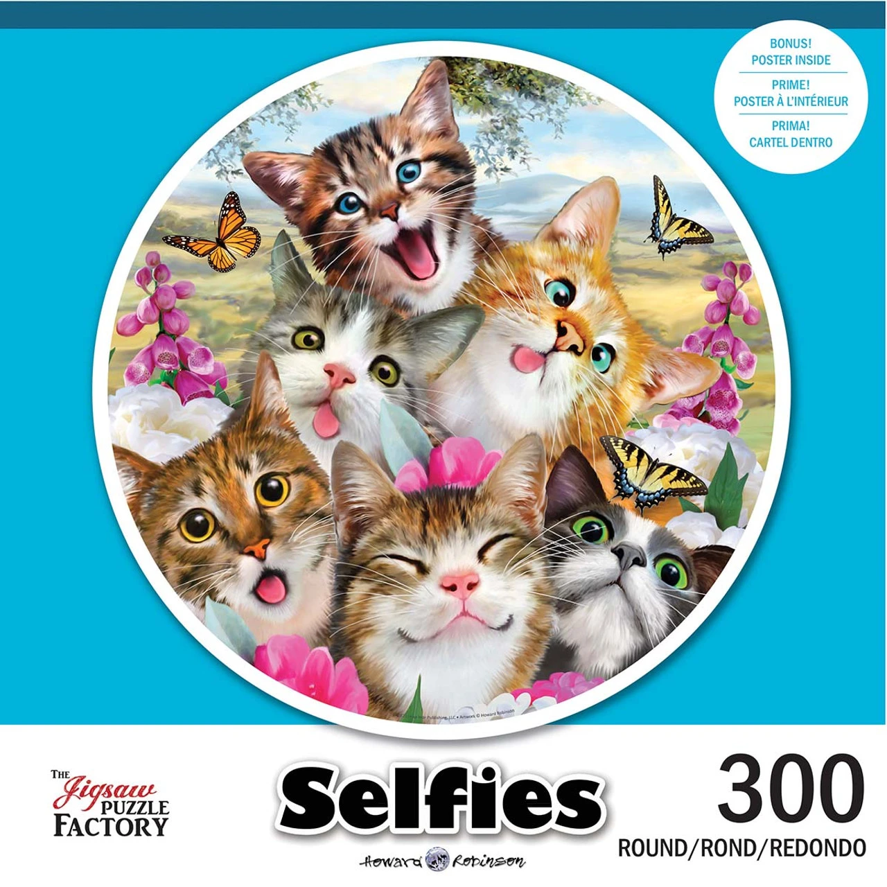 This 300-piece round jigsaw puzzle features a group of felines posing for a silly selfie! The playful image features the cats making funny faces at the camera as they snuggle up in a garden surrounded by pink flowers and little butterflies. Precision-cut pieces allow for fast assembly and a quality finished image. 24″ (61cm) dia.
