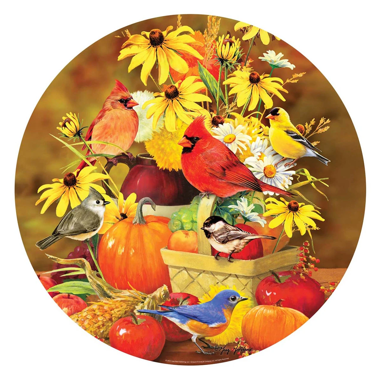 • The puzzle image features cardinals, chickadees, a gold finch, and a bluebird perched on an autumn arrangement of pumpkins, apples, corn, black-eyed susans, and daisies.