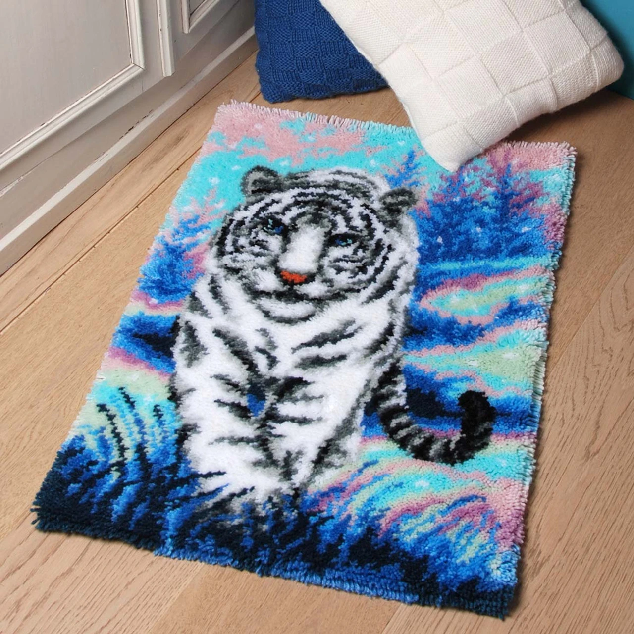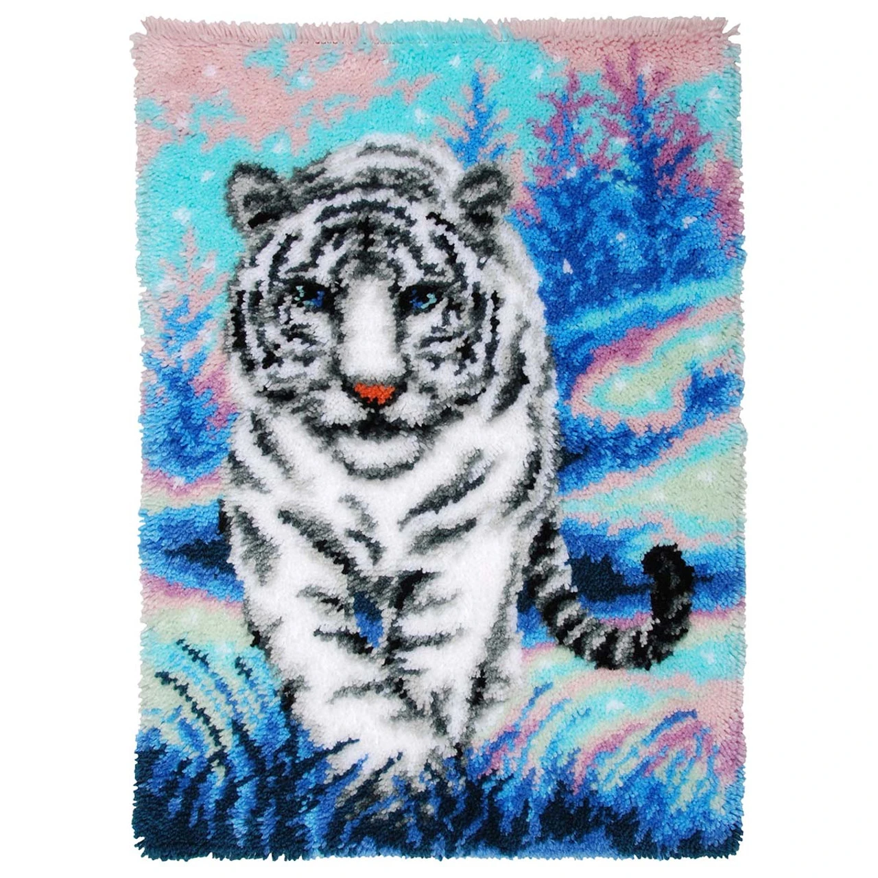 This wintry latch hook design features a white tiger walking across a snowy landscape surrounded by trees and falling snow. Pastel shades of pink and blue bring a whimsical feel to this wildlife design. Designed for easier, more enjoyable latching, this premium latch hook design is printed right on the canvas. This makes creating this latch hook project easier as you do not need to count squares, and you check the chart less as you work. The kit includes 4.5-mesh hand-painted canvas, lofty pre-cut acrylic yarn, latch hook tool, and chart. Rug binding and non-slip backing not included. The higher-gauge canvas of this project allows for a high level of detail in the finished design. 22 x 32″ (56 x 81cm). Imported.