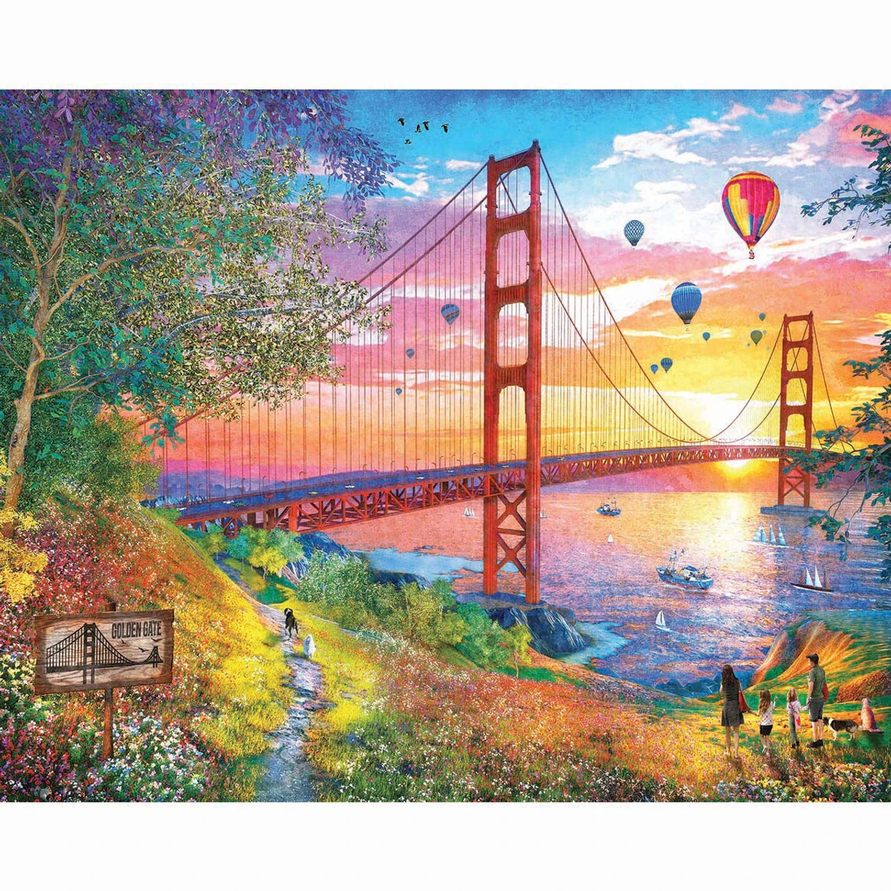• The puzzle image features a family and dogs walking through a park filled with flowers offering a scenic view of Golden Gate Bridge as boats travel through San Francisco Bay and hot air balloons sail across the sky at sunset.