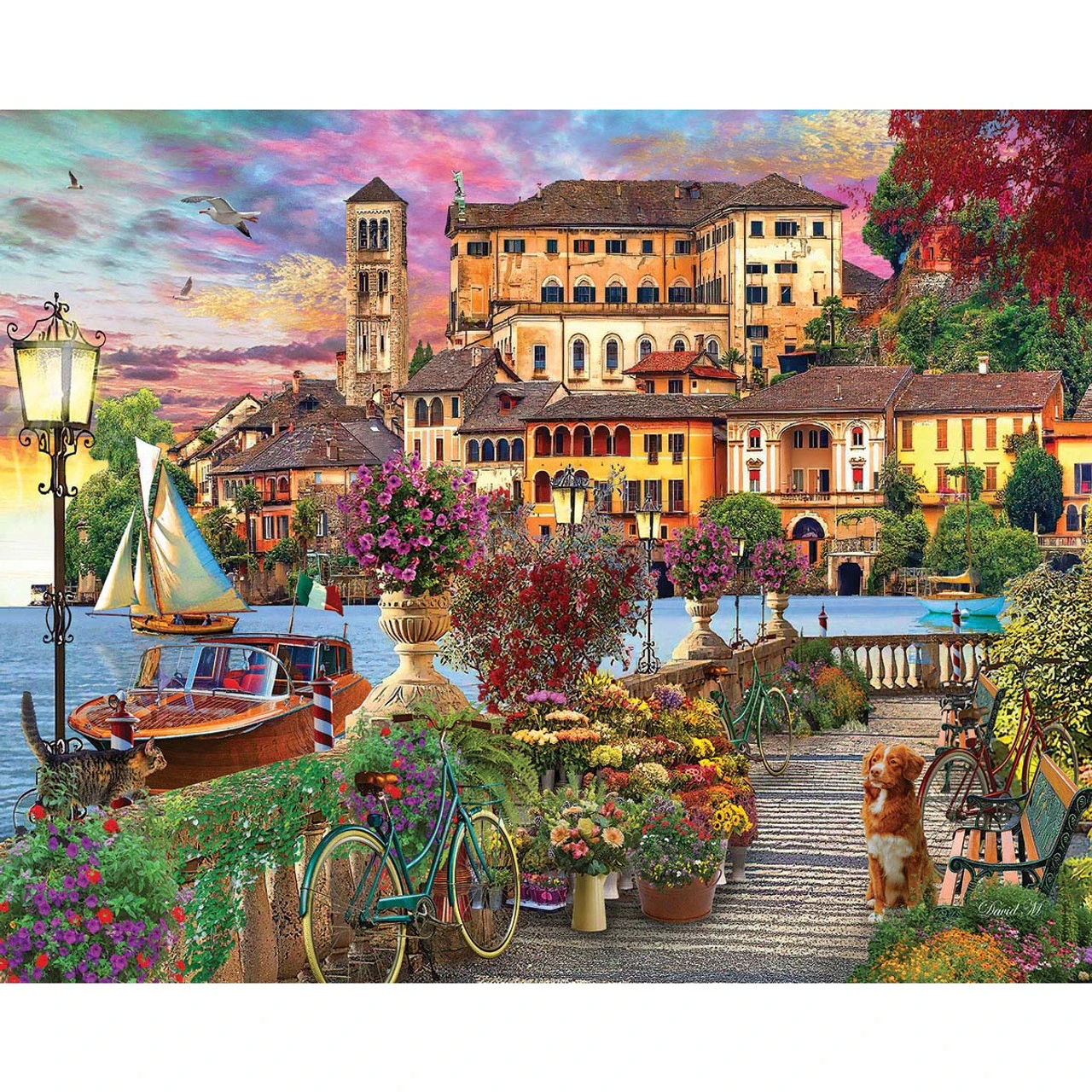 This 1,000-piece jigsaw puzzle features a charming view of Italy, inviting you to stroll down the flower-lined promenade and enjoy the sunset over the water. A cute dog sits patiently next to a park bench on this walkway lined with bicycles and potted plants, offering a serene view of the canal where boats bob along the water lined with tall houses and a church steeple in the distance in front of a sky illuminated with vibrant colors from the setting sun. This puzzle is made in the U.S.A. from 100% recycled premium blue chipboard. Precision-cut pieces allow for fast assembly and a quality finished image that can be framed as fun wall art (frame not included). 30 x 24″ (76 x 61cm).